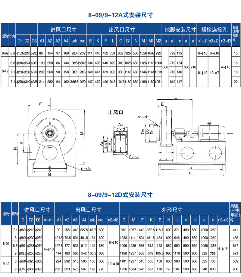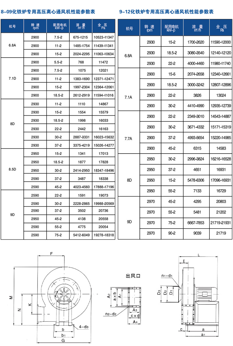 產品詳情 8-09、9-12型高壓離心通風機 8-09、9-12型化鐵爐專用高壓離心通風機,適合于1L/h、2 L/h、3 L/h、5 L/h、7 L/h熔化率的化鐵爐鼓風性能要求。該風機還可作為各種熔爐、鍛冶爐的鼓風用,也適用于輸送空氣及無腐蝕性、不自然、不含有粘性物質的氣體。輸送介質的溫度不超過80℃,介質中所含的塵土及硬質細顆粒不大于150mg/ m3。