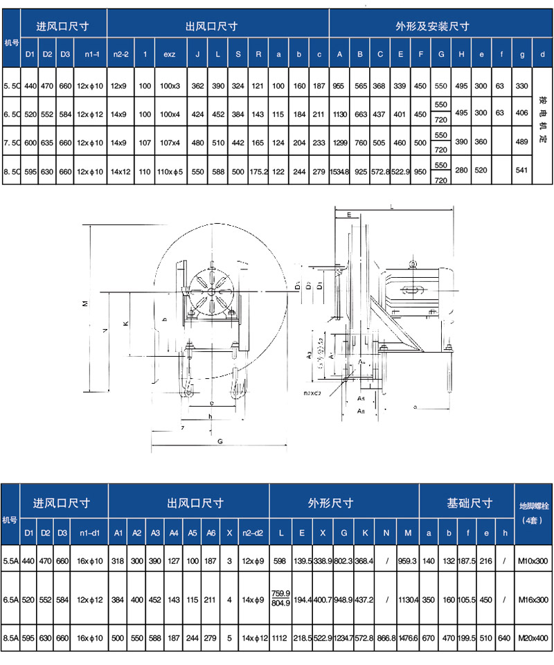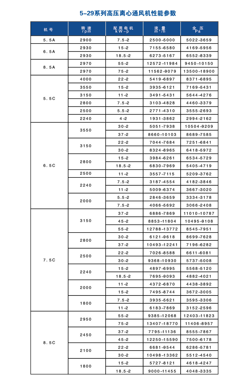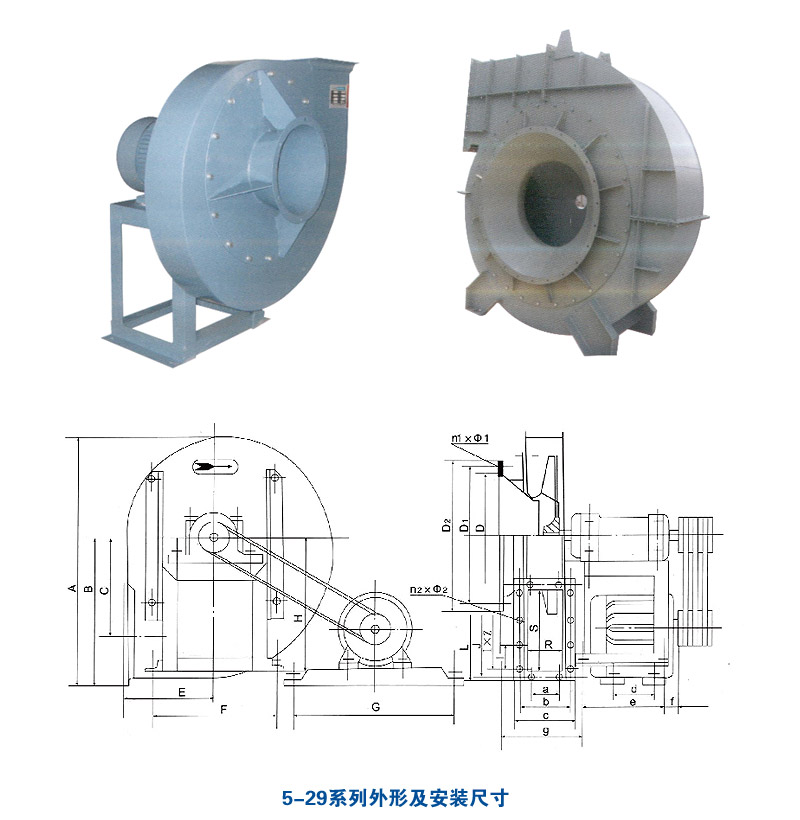 5-29系列高壓離心通風機 5-29型高壓離心通風機用于輸送,吸引空氣及輸送無腐蝕性、不自燃、不含有粘性物質的氣體,尤其適用于棉絨加工輸送,亦可用于沖天爐吹煉,輸送介質溫度不超80℃,含塵最不超過150mg/ m3,具有效率高,能耗低的特點。