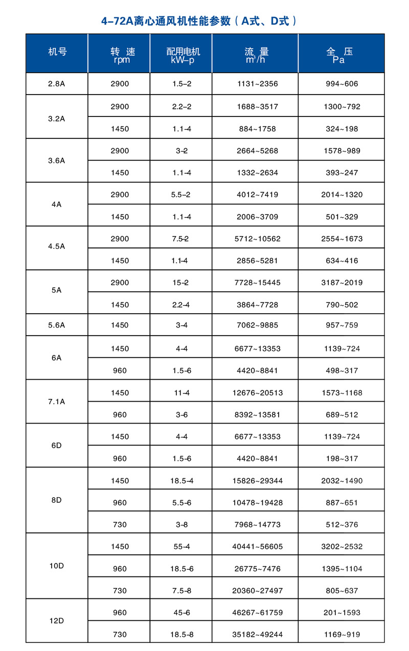 4-72系列離心通風機 4-72系列離心通風機可輸送空氣和其它不自燃的、對人體無害的、對鋼材無腐蝕性的氣體。氣體內不允許有粘性物質,所含塵土及硬質顆粒大于150mg/m3。氣體溫度不得超過80℃。該風機具有良好的氣動性能、運轉平穩、振動小、效率高、壽命長等特點。廣泛適用于工礦企業、大型建筑物、賓館酒樓等室內通風換氣。