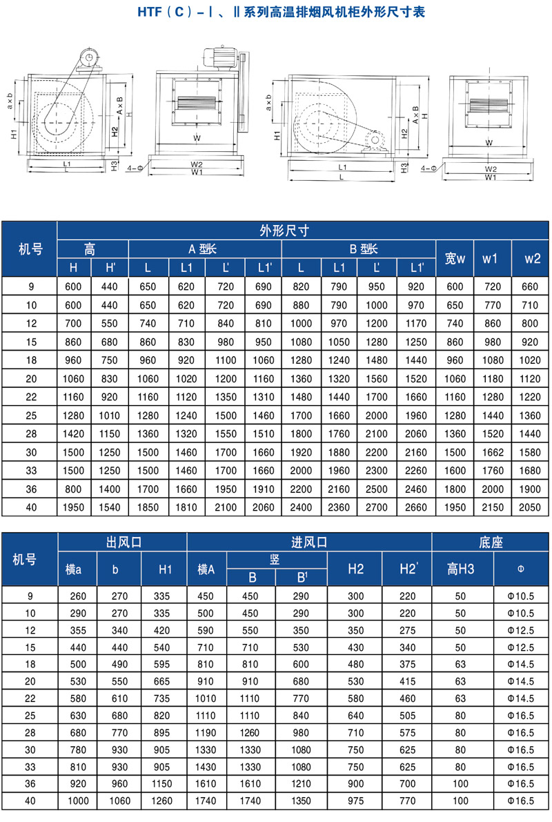 本系列產品分A型和B型兩種,電動機安裝在箱體外的為A型,按GA211-2009消防風機耐高溫試驗方式,能在煙氣溫度大于280℃高溫情況下,能連續運轉40分鐘以上,達到消防排煙之目的,配用雙速電機后,既可在低速時通風換氣,又可在高速時消防排煙,為一機二用;電動機安裝在箱體內為B型,一般作送排通風使用。